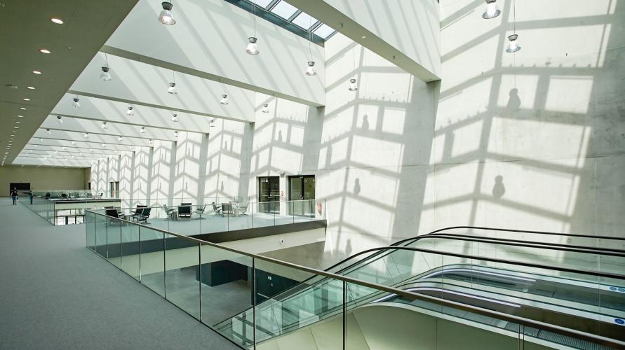 - Die obere Ebene ist eine säulenfreie Halle (12 m lichte Höhe), die für große Plenarsäle, Ausstellungen, Events oder Catering verwendet werden kann
